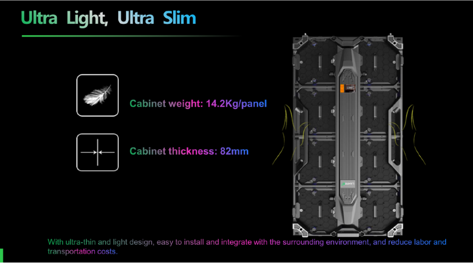 82mm cabinet thickness and 14.2kg per panel. Significantly lower transport and on-site labour costs for the SI partner compared to conventional outdoor LED cabinet systems.